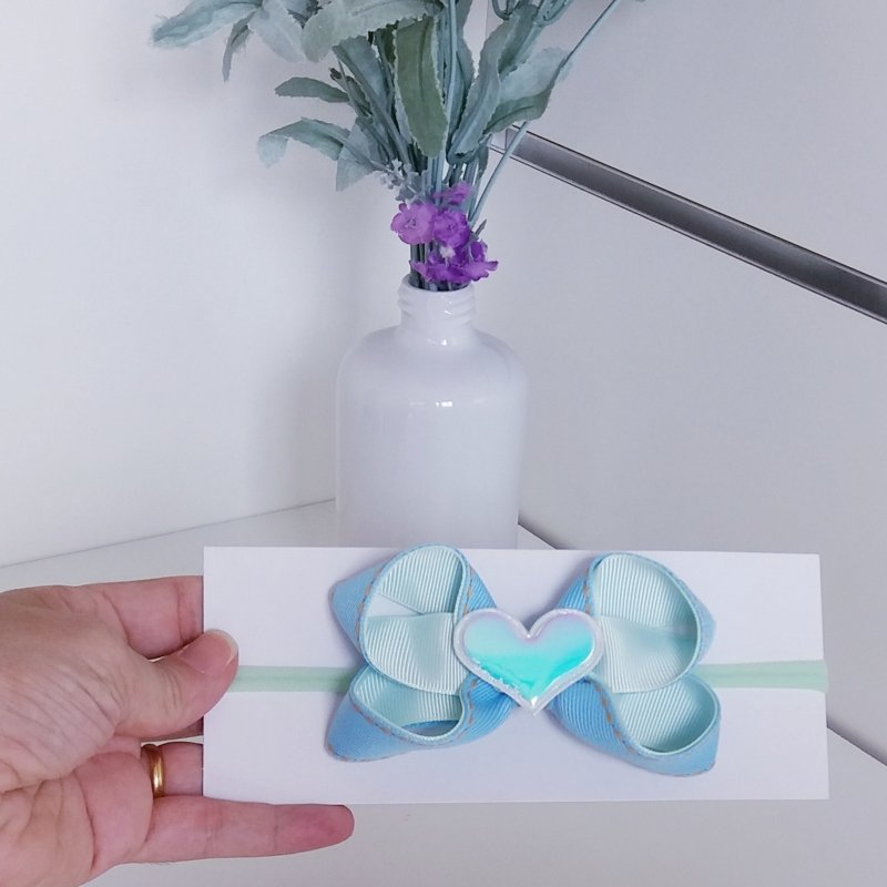 Faixa Meia de Seda Pequena Verde Agua/Jeans Coração Holografico