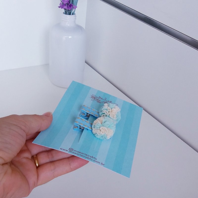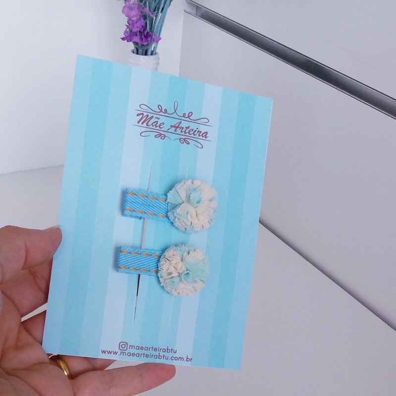 Hair Clip 2 Pequeno Jeans Claro/Pompom Bege Verde