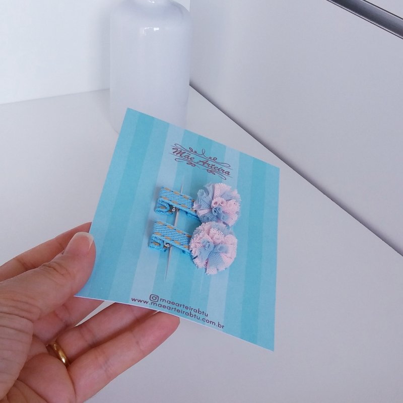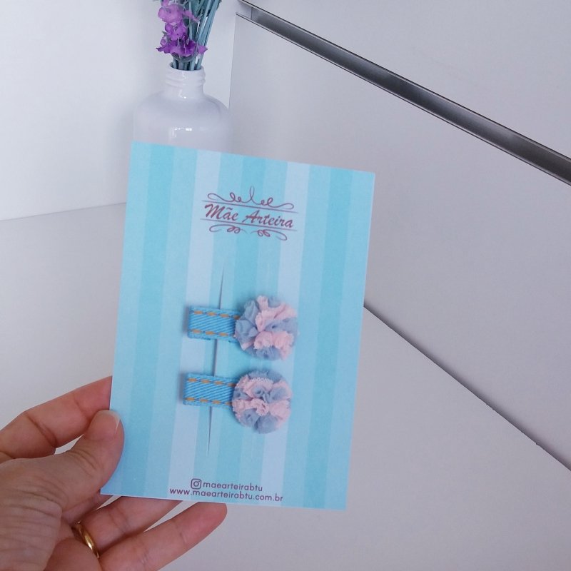 Hair Clip 2 Pequeno Jeans Claro/Pompom Rosa Azul