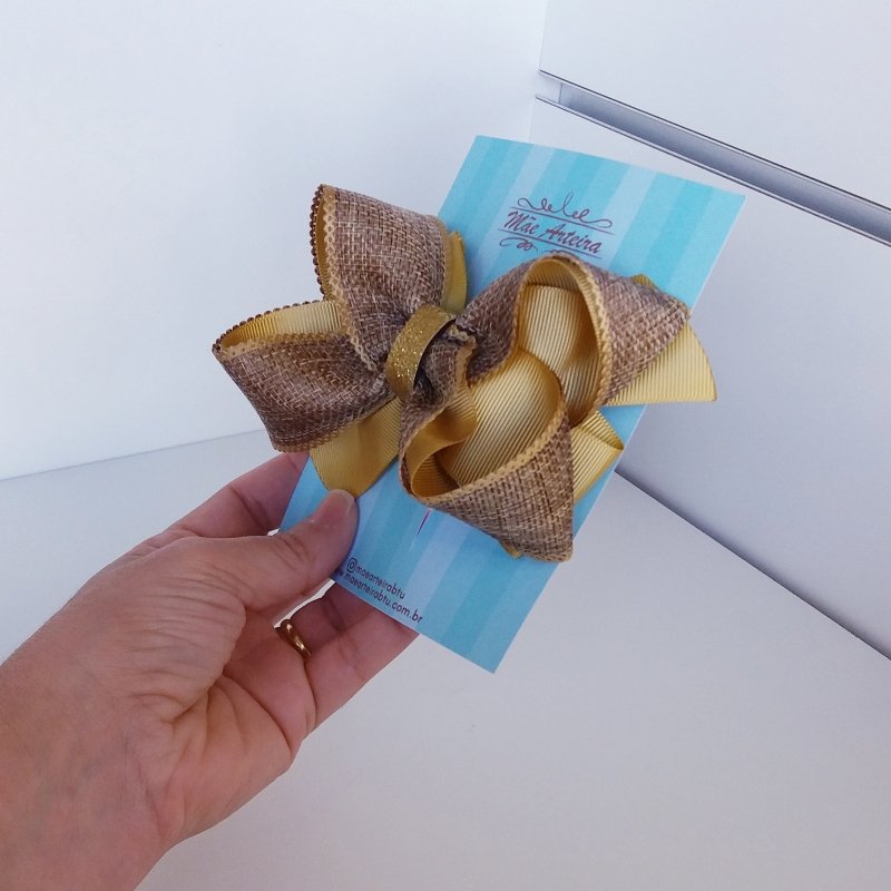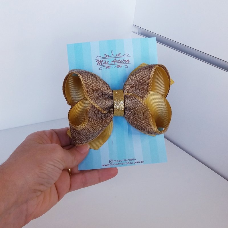 Laço Boutique Duplo Grande Mostarda Juta Natural/Brilho