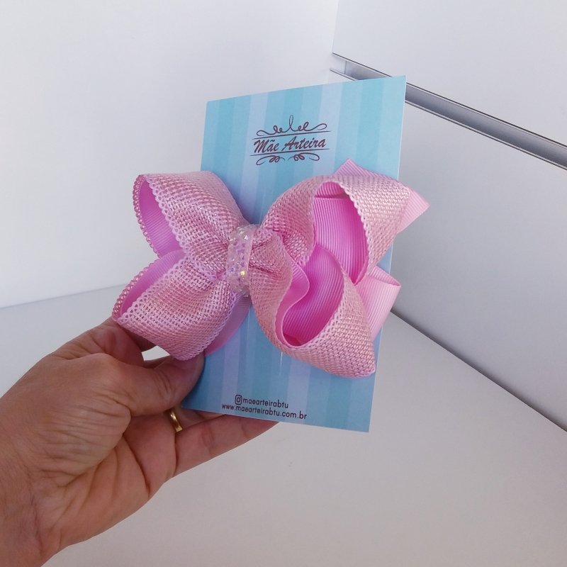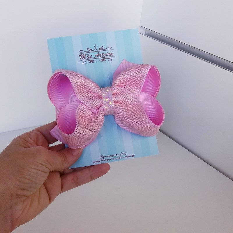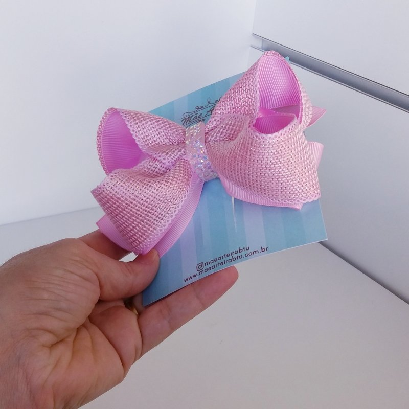 Laço Boutique Duplo Grande Rosa Bebê Juta/Brilho