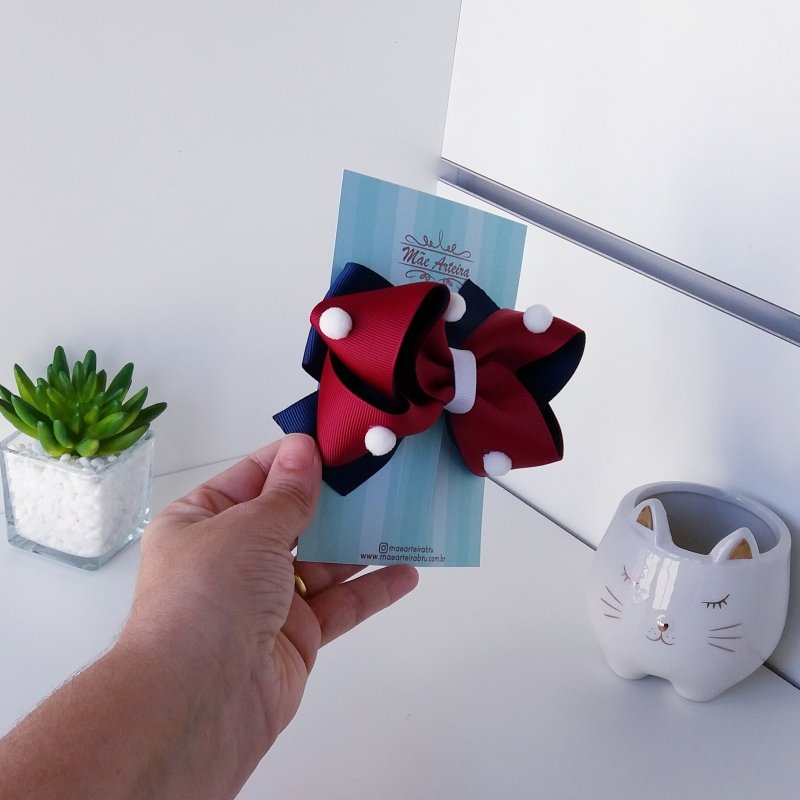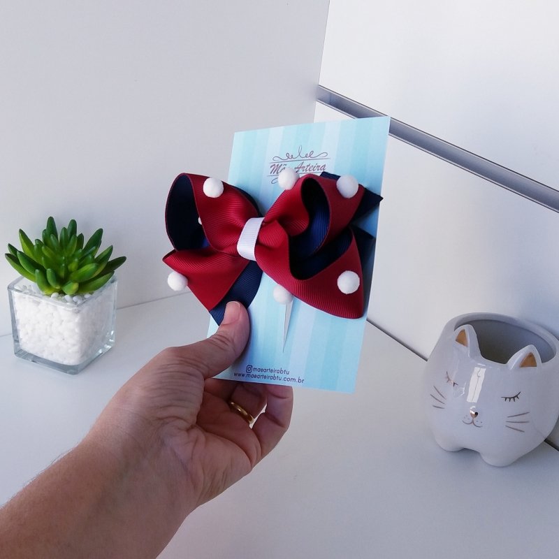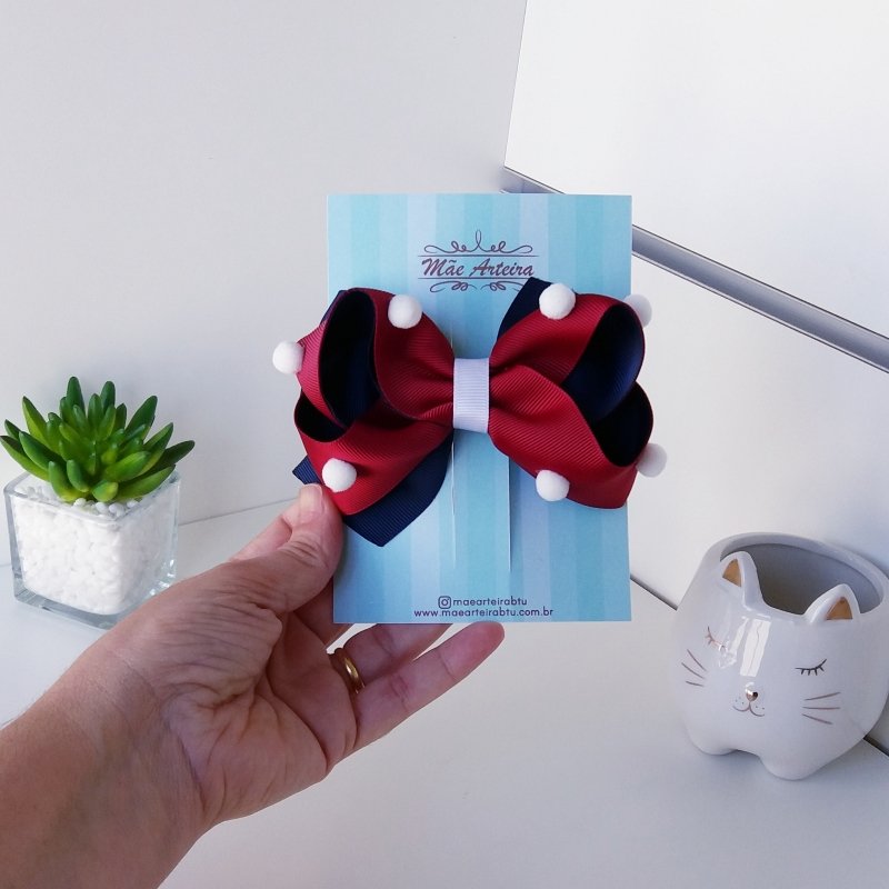 Laço Boutique Duplo Grande Vermelho e Azul/Pompom