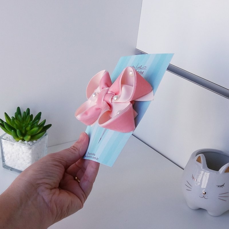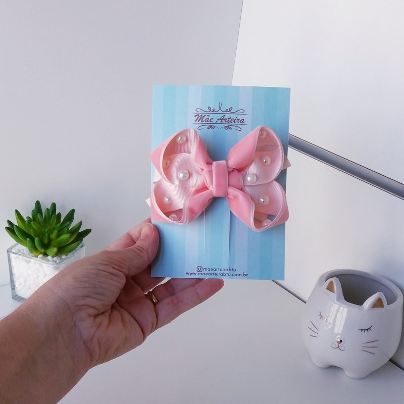 Laço Boutique Duplo Médio Veludo Pêssego/Pérola