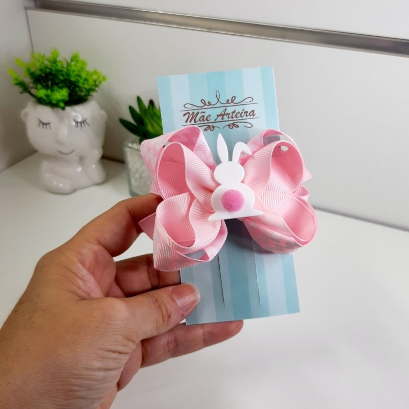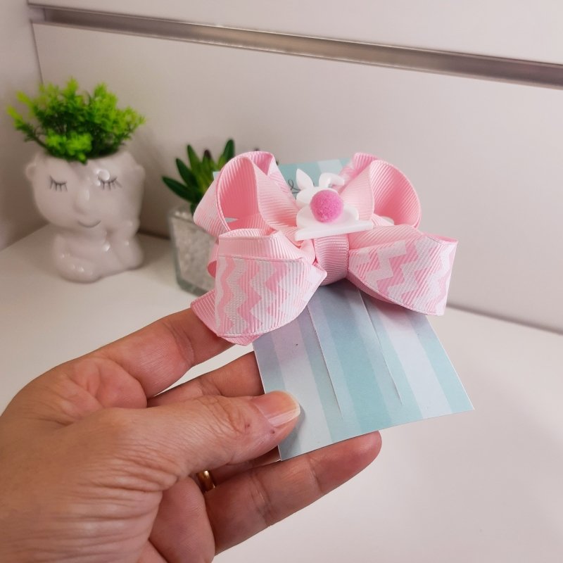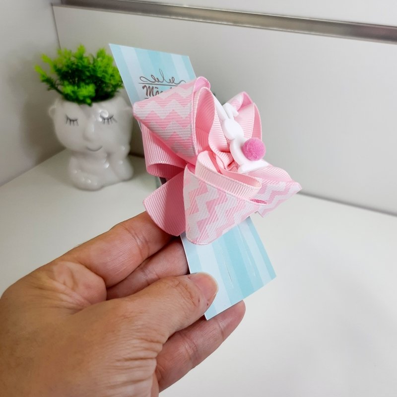 Laço Boutique Duplo Pequeno Rosa Chevron/Coelho Pompom