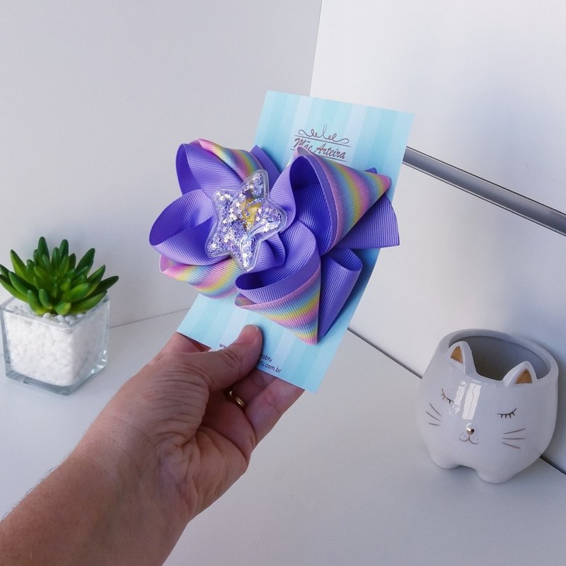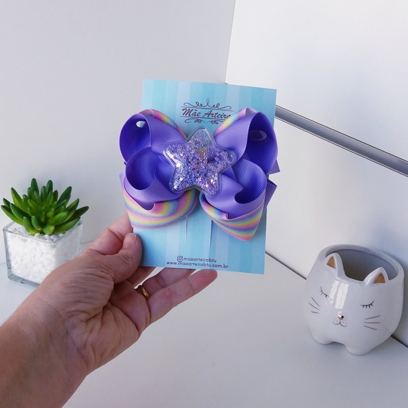 Laço Boutique Sobreposto Grande Arco-íris e Lilás/Star Transparente
